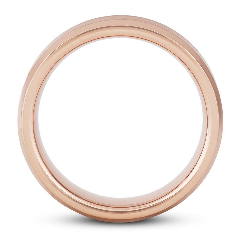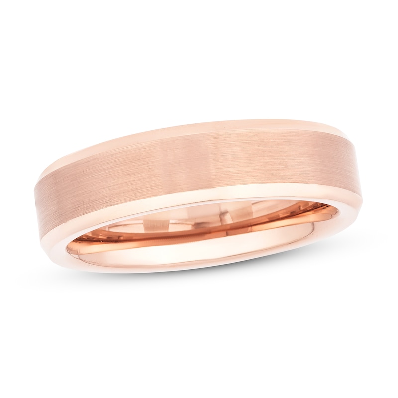 A satin finish and polished edges add subtle contrast to this dashing wedding band. Crafted of rose tungsten carbide, the 6mm band is This wedding band is available in sizes for men or