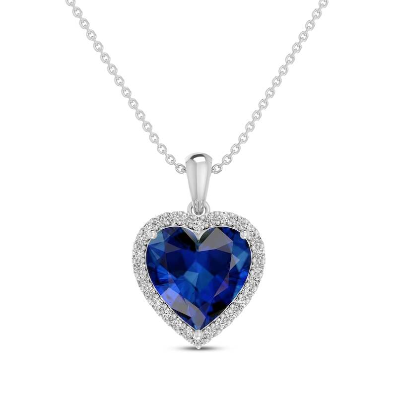 A rich heart-shaped blue lab-created sapphire gleams within a frame of white lab-created sapphires on this stunning necklace for her. Fashioned in classic sterling silver, the pendant