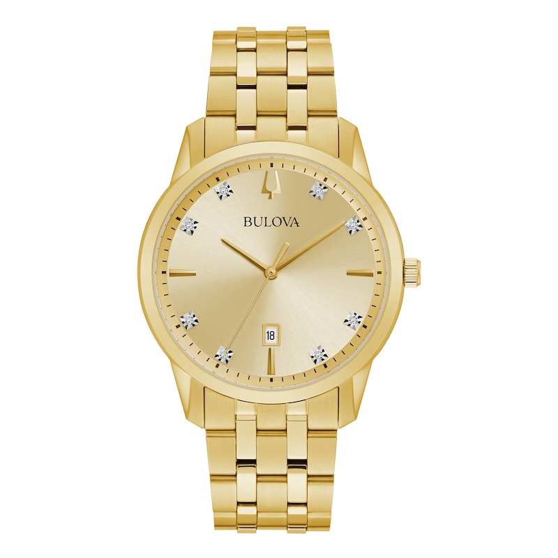 This handsome Bulova Men's Classic Sutton Watch features a gold-tone stainless steel case and bracelet with a champagne dial, futher embellished with eight diamonds set on the dial.