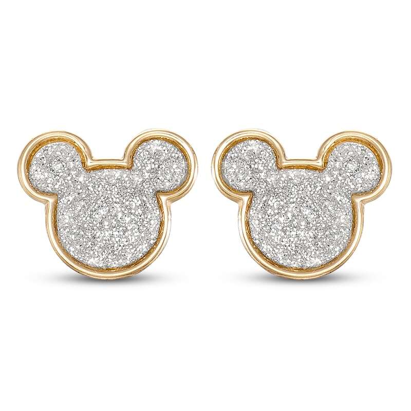 These recognizable children's stud earrings feature Mickey's silhouette crafted in classic 14K yellow gold. The earrings feature a silver glitter design for a fun look. The earrings