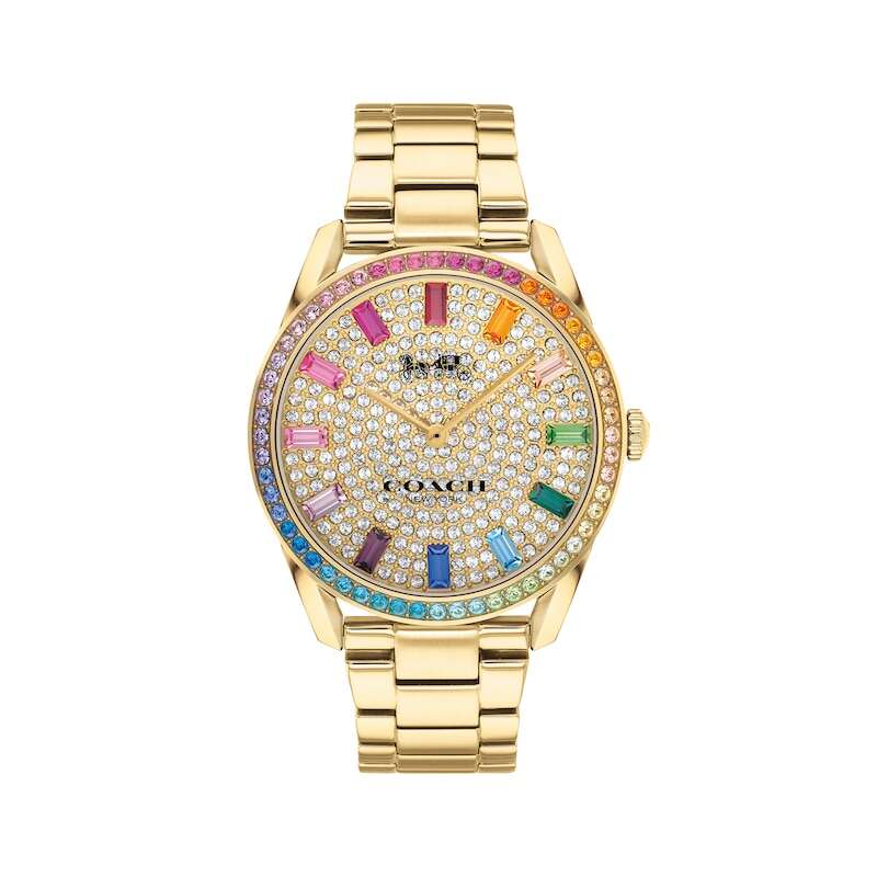 The Preston watch is an elegant pick for every day. This gold-tone timepiece sparkles with crystals in rainbow hues on the bezel and markers with clear pavé on the dial. Featuring a