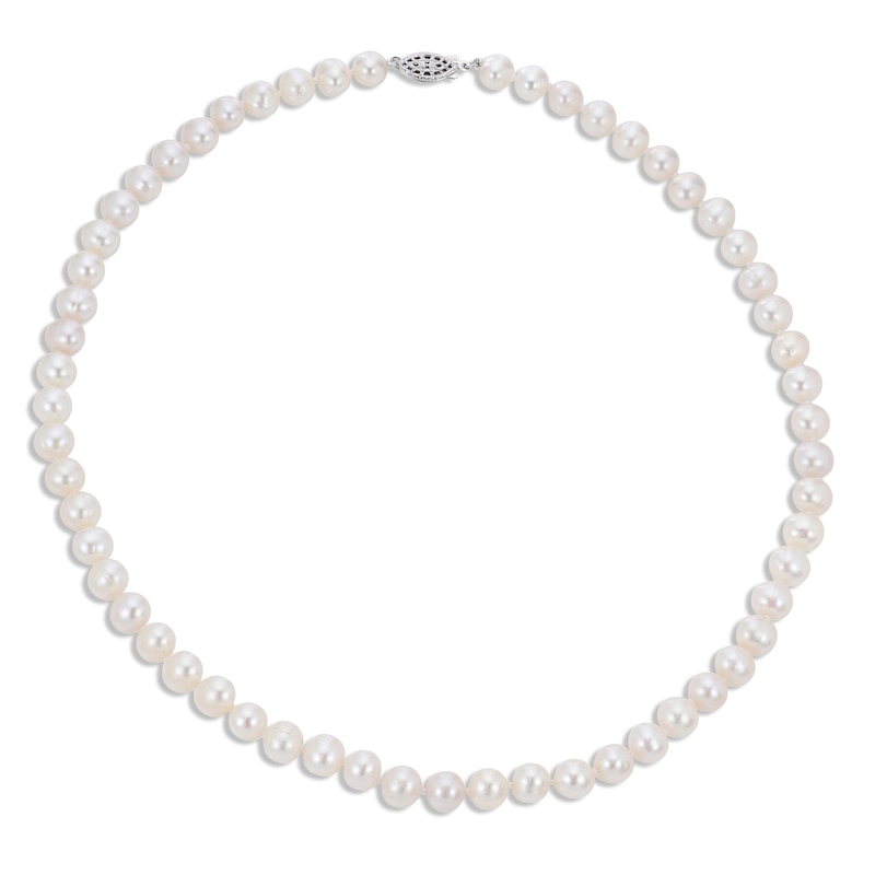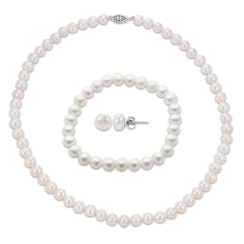 This freshwater cultured pearl gift set includes a matching necklace, bracelet and stud earrings set in sterling silver. The necklace fastens with a fishhook clasp, the bracelet stretches to fit, and the earrings secure with friction backs. The set comes nestled in a gift-worthy black wooden box.