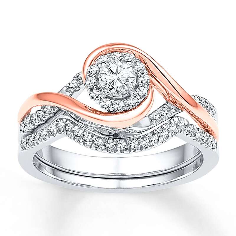 This alluring bridal set for her features a round diamond encircled in more round diamonds at the center of the engagement ring. Swirls of 10K rose embrace the center while diamonds
