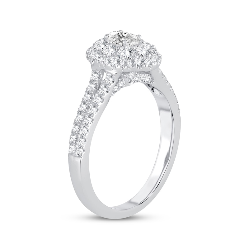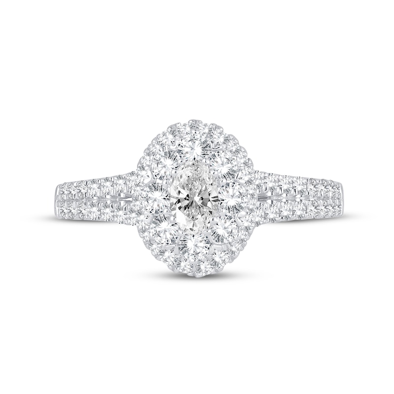 A tribute to your timeless love, this beautiful engagement ring showcases a 1/4-carat oval-cut diamond surrounded by a double halo of round diamonds at the center. Two rows of round diamonds shimmer down the split-shank band and gleam across the bridge. The ring is styled in 14K white gold with a rhodium finish and has a total diamond weight of 1 carat. From the Now & Forever® bridal collection.