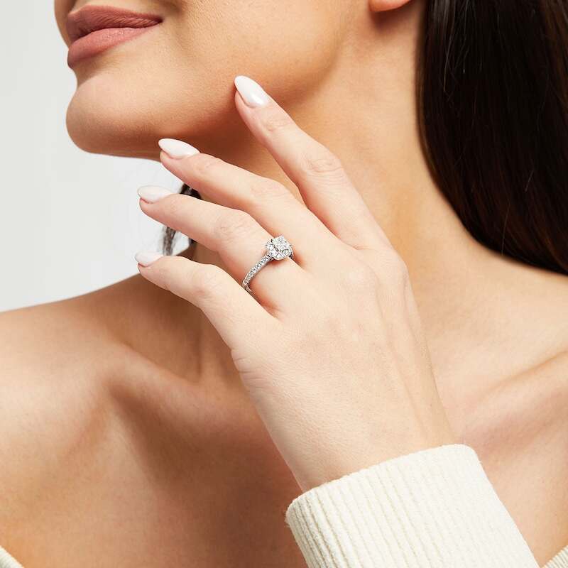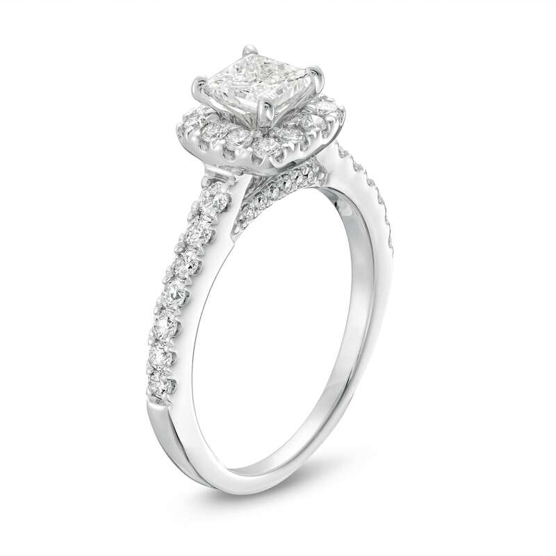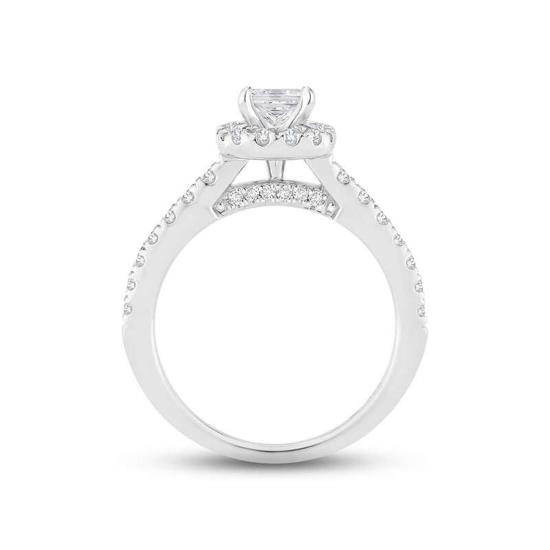 A dazzling 5/8-carat princess-cut diamond is framed in shining round diamonds at the center of this gorgeous engagement ring for her. Additional round diamonds shimmer halfway down the band and sparkle across the bridge for extra allure. The ring is styled in iconic 14K white gold and has a total diamond weight of 1 1/6 carats. From our Now and Forever® bridal collection.