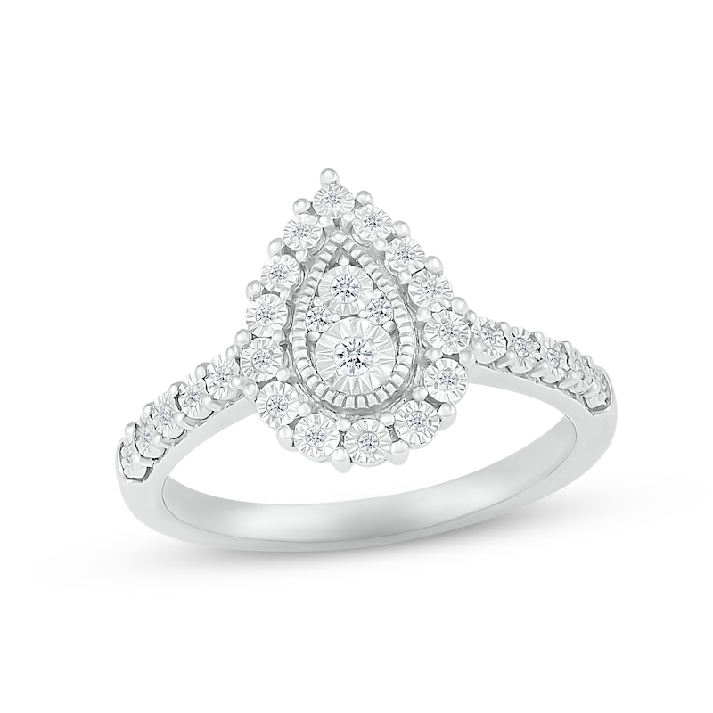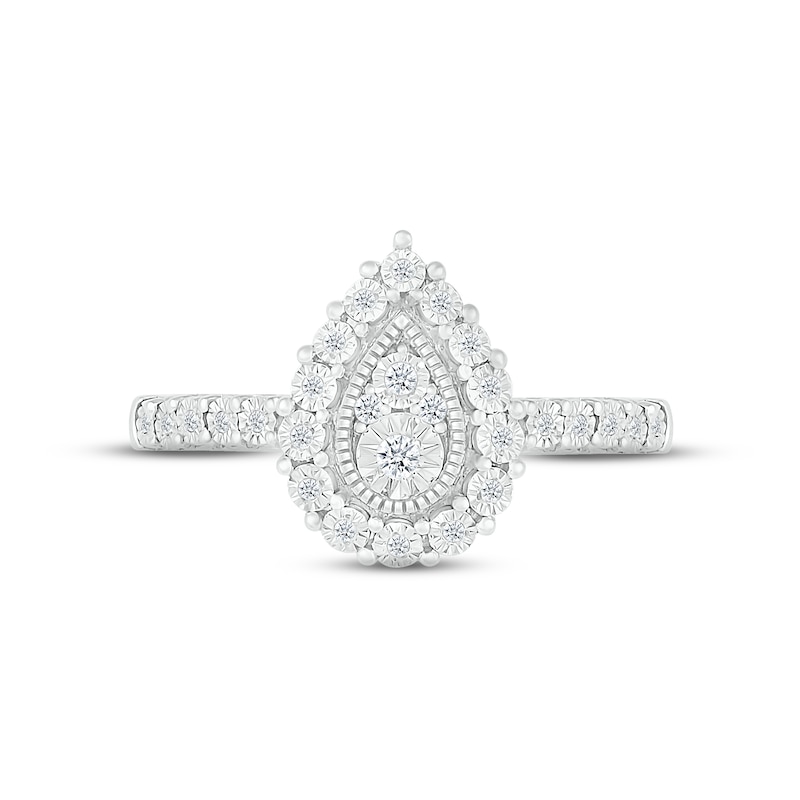 Dazzle her with this unique and elegant promise ring, featuring brilliant round diamonds that are artfully set to enhance size and sparkle. A pear-shaped quartet of twinkling round
