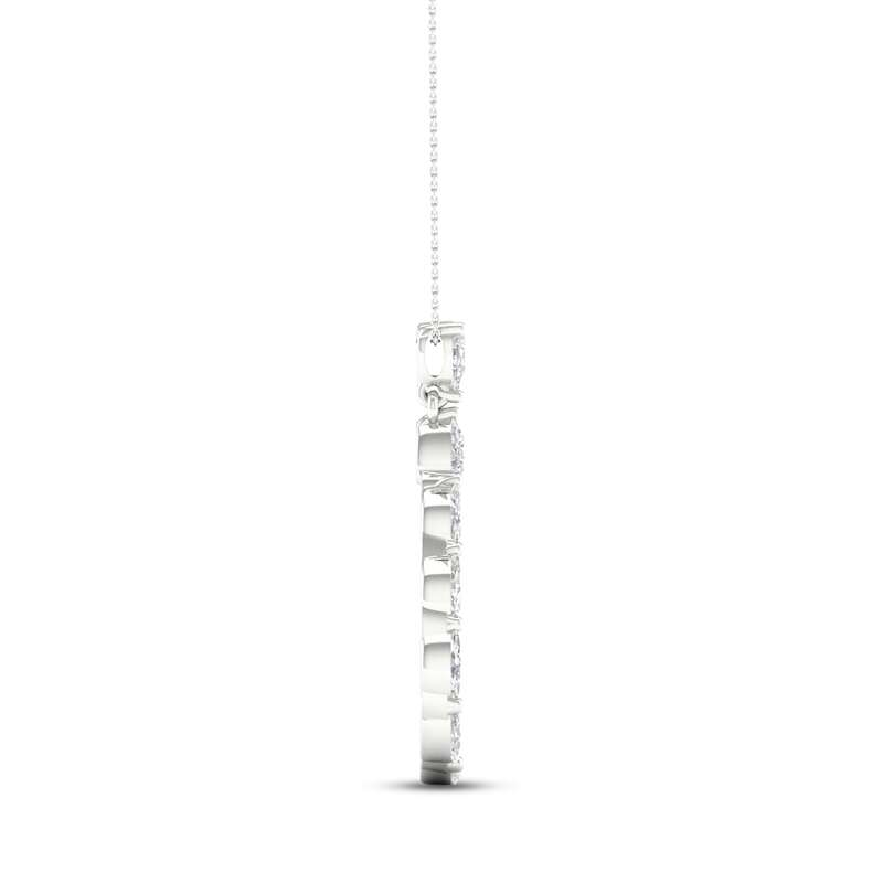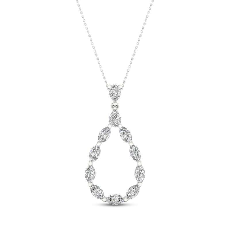 Dazzling marquise and pear-shaped diamonds trace a beautiful teardrop design on this gorgeous necklace for her. Fashioned in iconic 14K white gold, the necklace has a total diamond weight of 1 1/2 carats. The pendant sways from an 18-inch cable chain that secures with a lobster clasp.