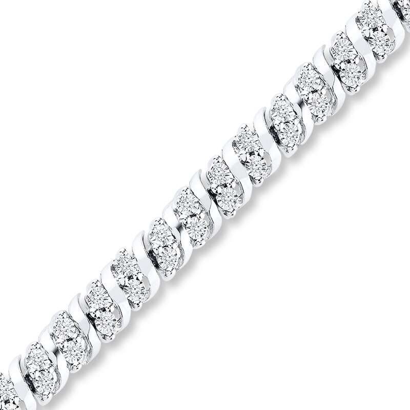 Pairs of round diamonds alternate with curves of sterling silver in this magnificent bracelet for her. The 7-inch bracelet has a total diamond weight of 1/2 carat and secures with a lobster clasp.