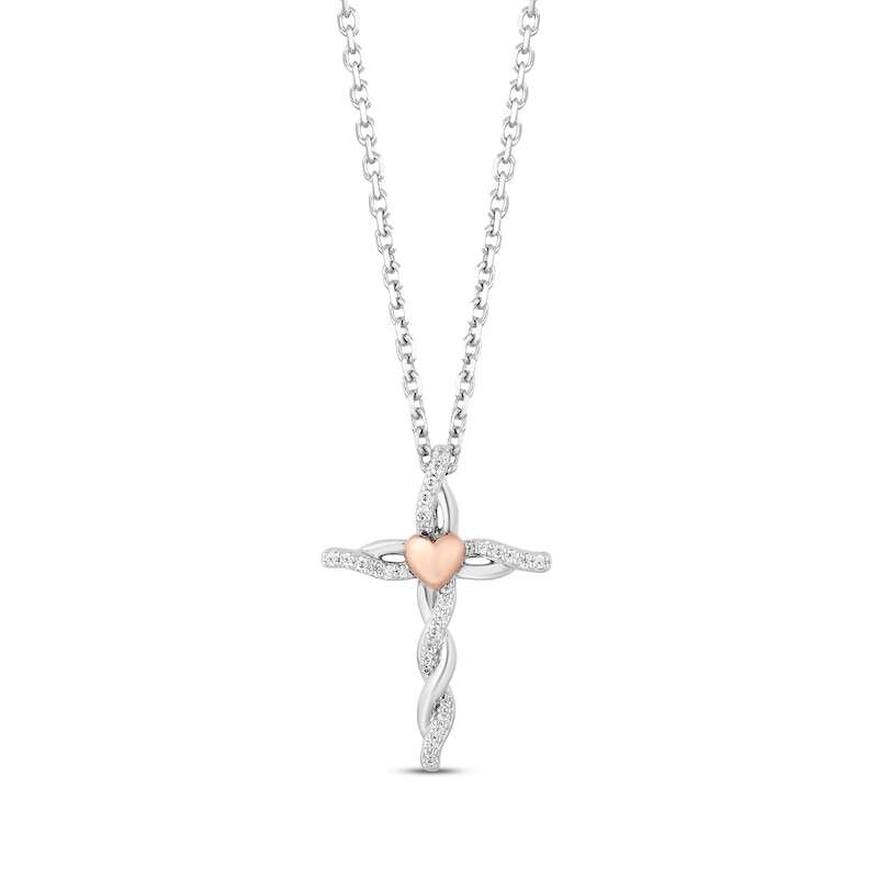 With love and faith, this diamond cross necklace speaks her truth. Crafted in sterling silver, this necklace features a 10K rose gold heart at the center of twisting round diamond-lined