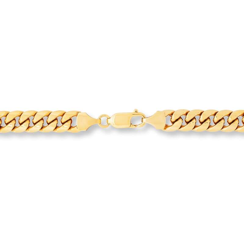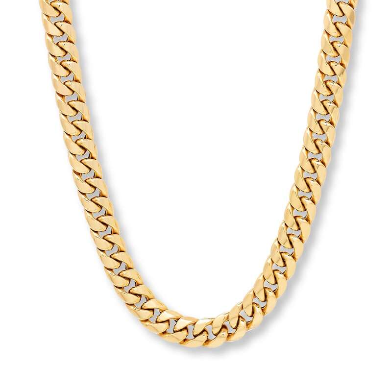 Bold and distinguished, this 10K yellow gold hollow Miami Cuban chain necklace is 22 inches in length and fastens with a lobster clasp.