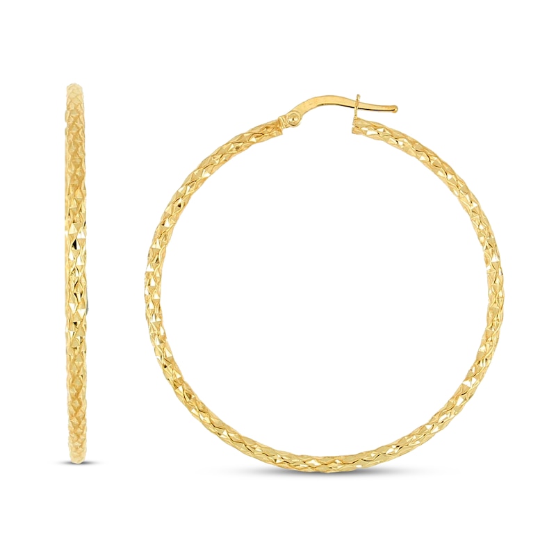 These stylish and modern 14K yellow gold hoop earrings are made more eye-catching with diamond-cut designs on the outside of the 14K yellow gold. The earrings secure with hinged backs.