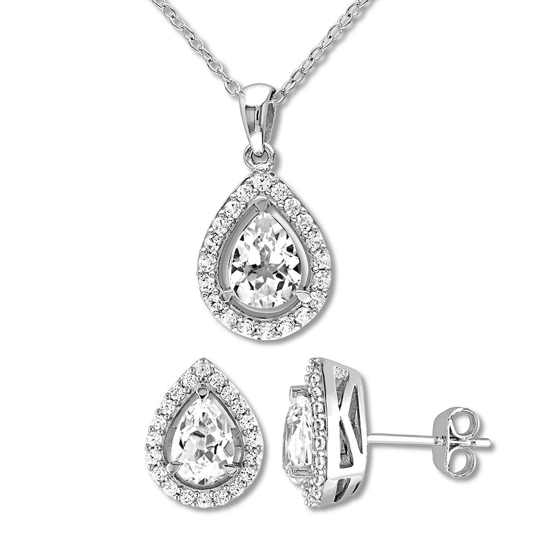 This splendid gift set for her includes a matching necklace and pair of earrings featuring dazzling pear-shaped, lab-created white sapphires. Frames of round lab-created white sapphires