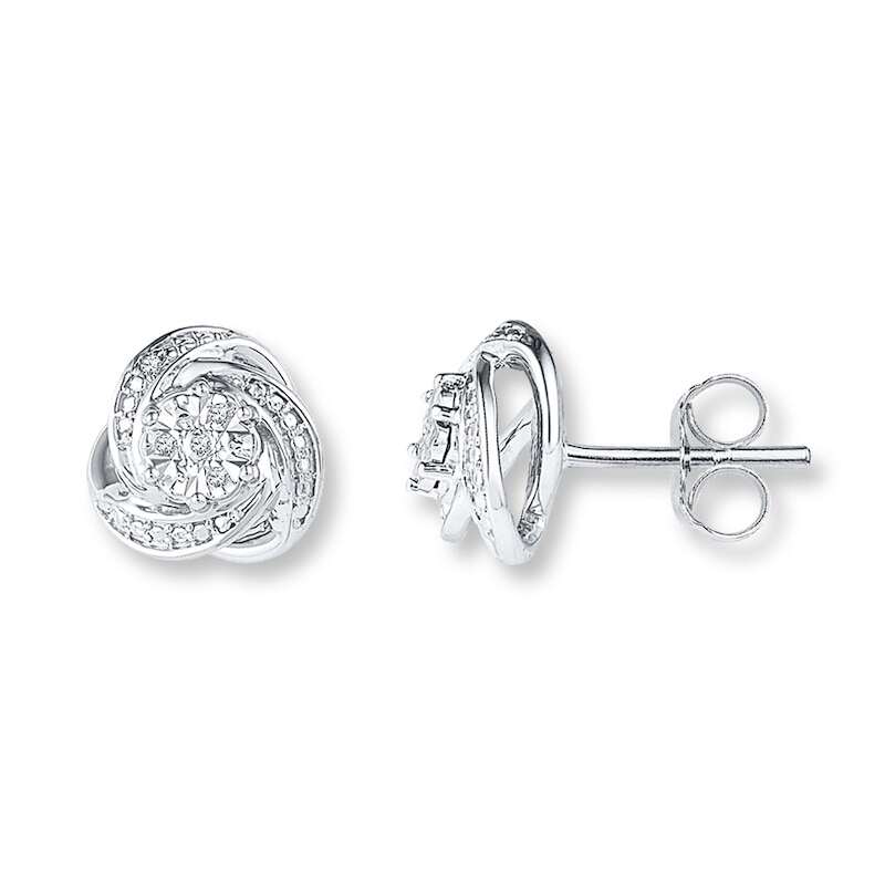 Sterling silver love knots, twinkling with round diamond accents, are the focal point of these versatile earrings for her. The earrings secure with friction backs.