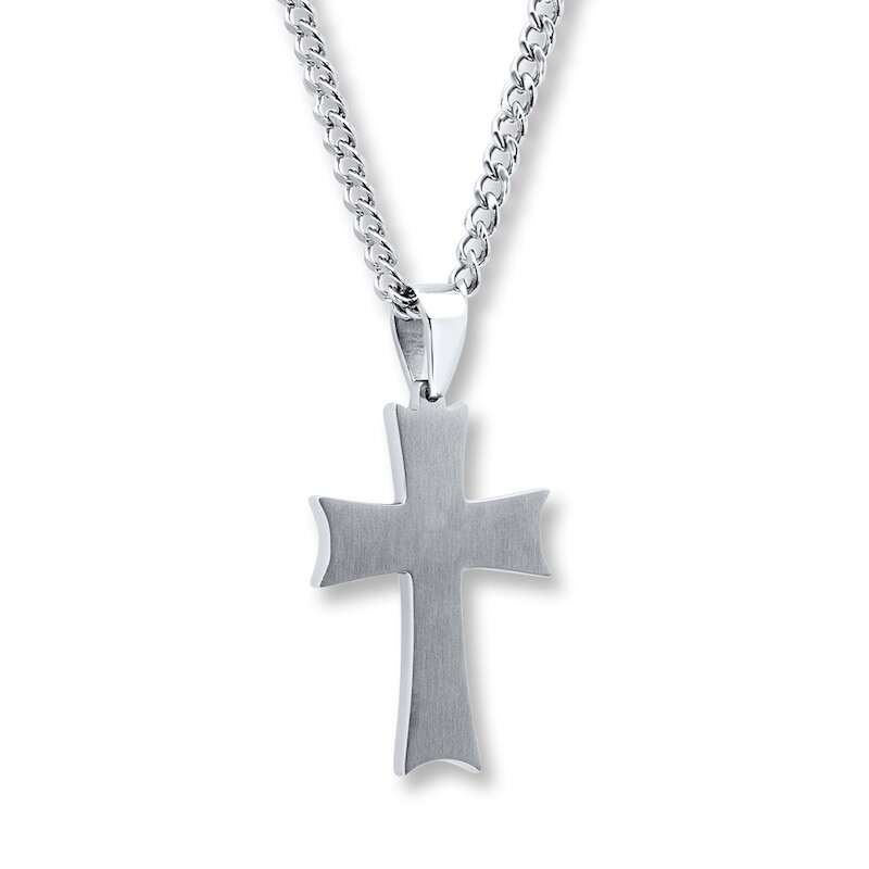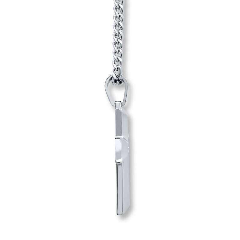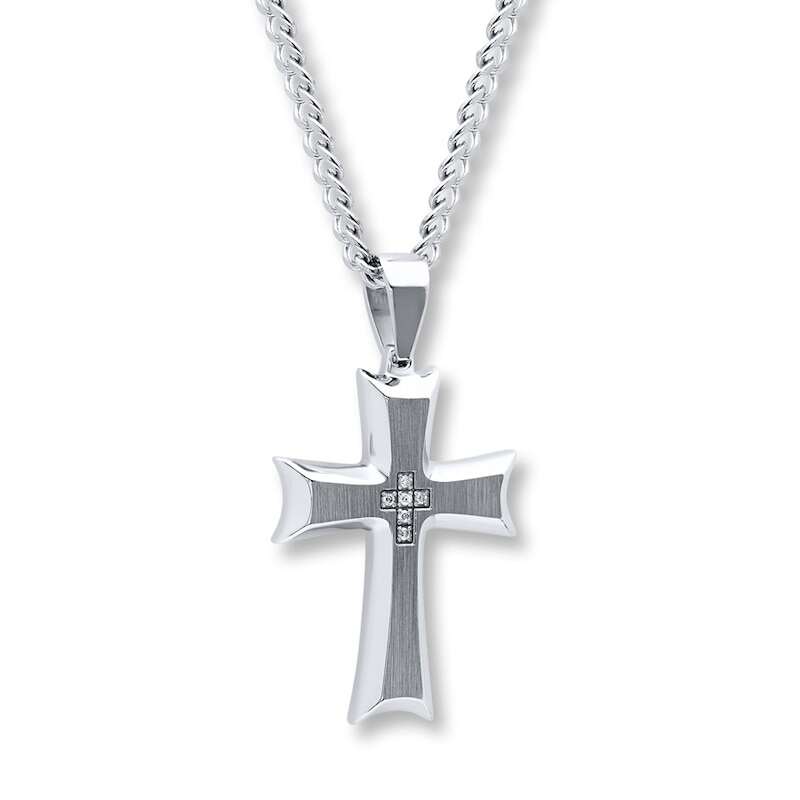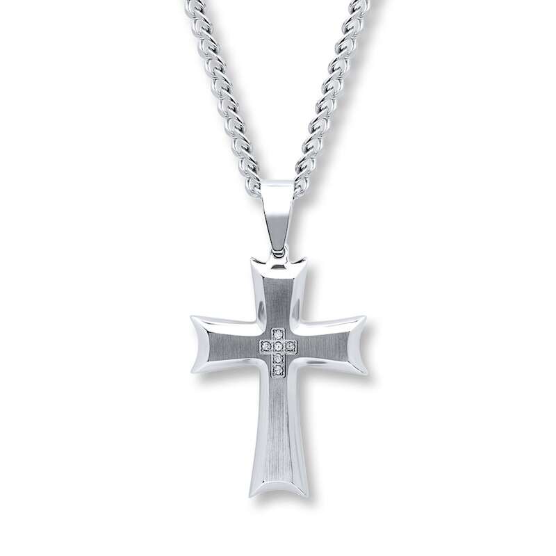 Twinkling round diamonds accent the center of this handsome men's cross necklace. Crafted of stainless steel, the pendant has a total diamond weight of 1/20 carat and suspends from a