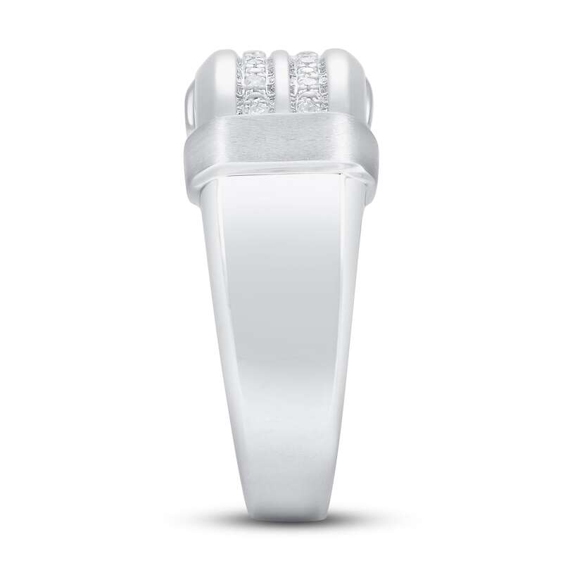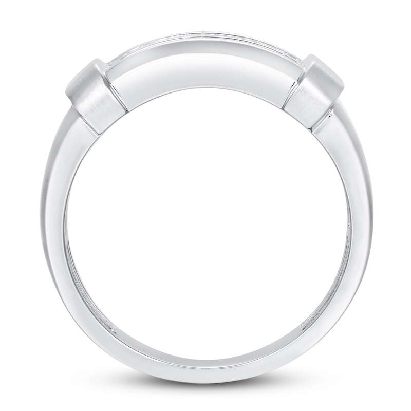 This stunning men's wedding band features two rows of beautiful round-cut diamonds at the center, for a total diamond weight of 1/15 carat. The band is crafted in 10K white gold with a