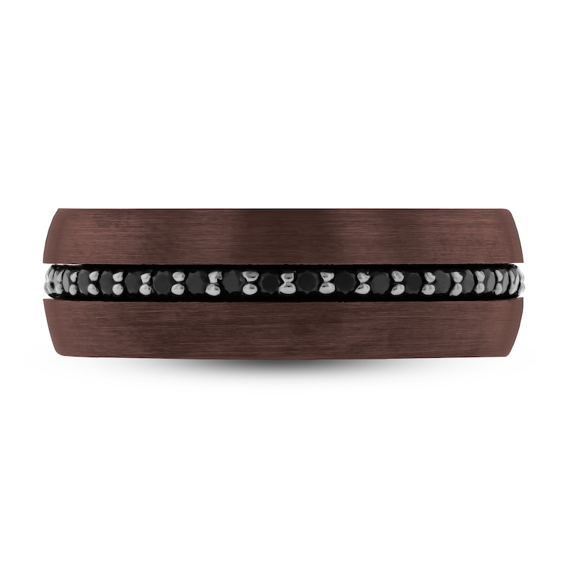 Sleek and modern, this men's wedding band features distinguished black tungsten gracing the outside and rose tungsten lining the inside of the band. Dashing black sapphires line the inside edge of the band to complete the look. The ring is a men's size 10.