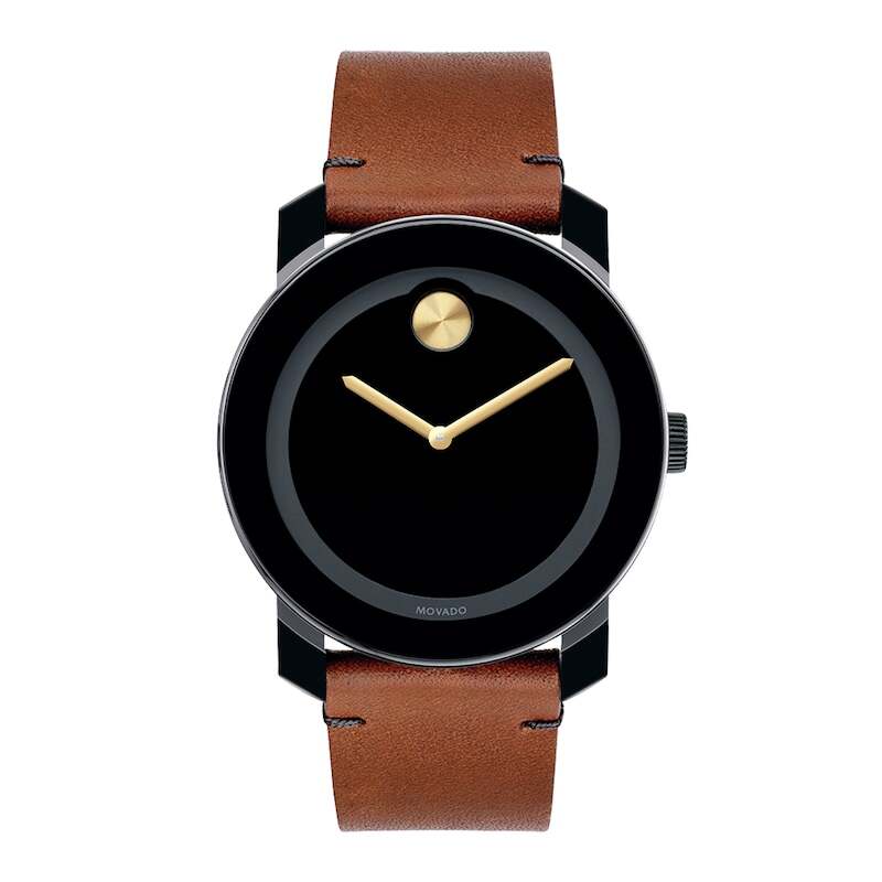 Distinguished by its black dial with a yellow-gold-tone sunray dot and hands set in a 42mm black TR90 composite material and stainless steel case, this large BOLD watch from Movado