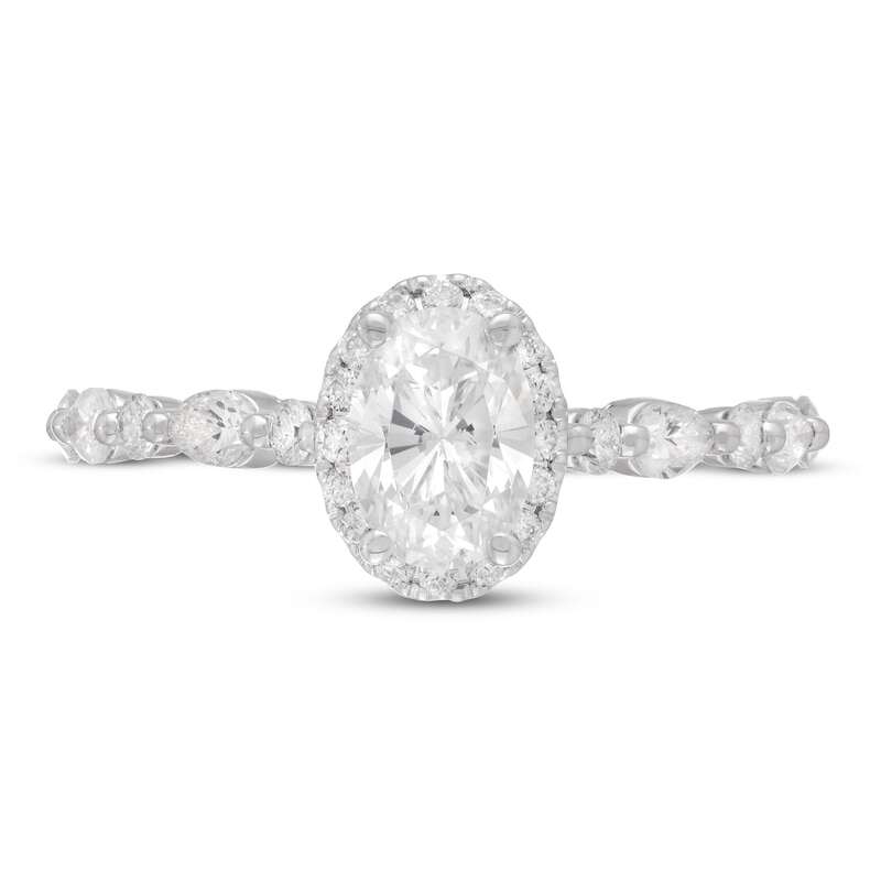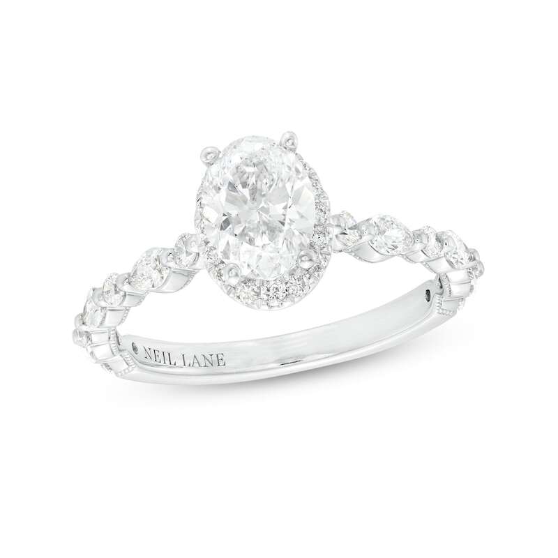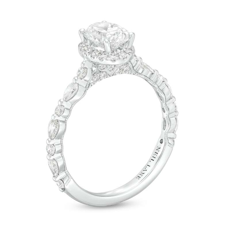 This gorgeous diamond engagement ring from the Neil Lane™ Premiere collection features an independently-certified 1 carat oval-cut diamond at its center. A halo of round-cut diamonds frames the center, and beautiful pear-shaped and round-cut diamonds dazzle down each side of the band. The 14K white gold ring has a total diamond weight of 1 1/2 carats, and the diamonds are independently certified. Milgrain detailing finishes the gorgeous design.
