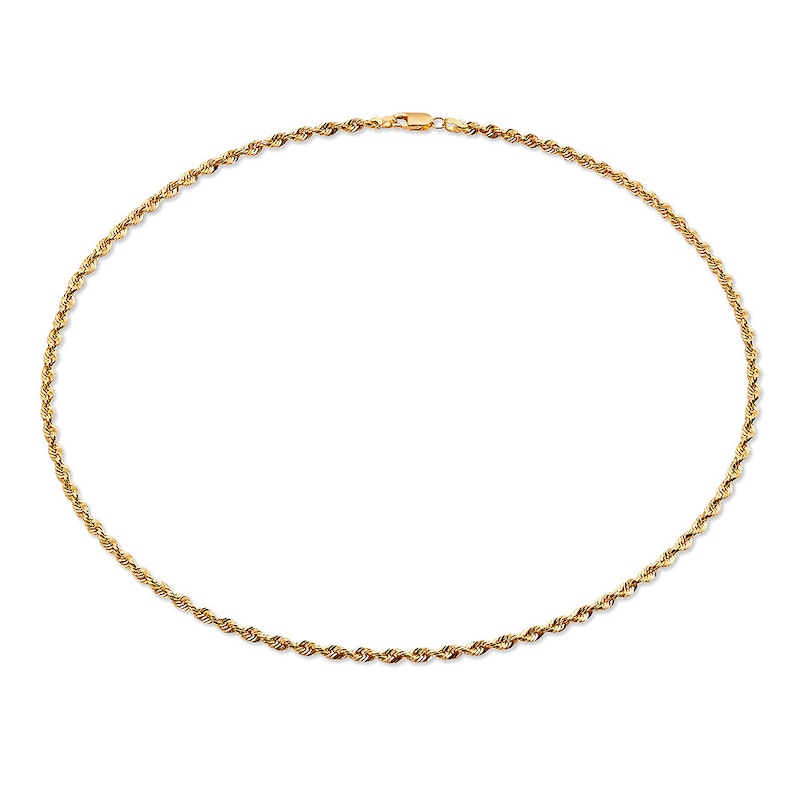 This 24-inch solid rope chain is styled in 14K yellow gold. The fine jewelry necklace is secured with a lobster clasp.