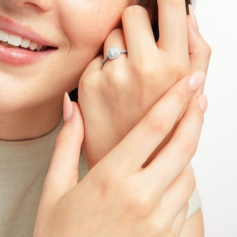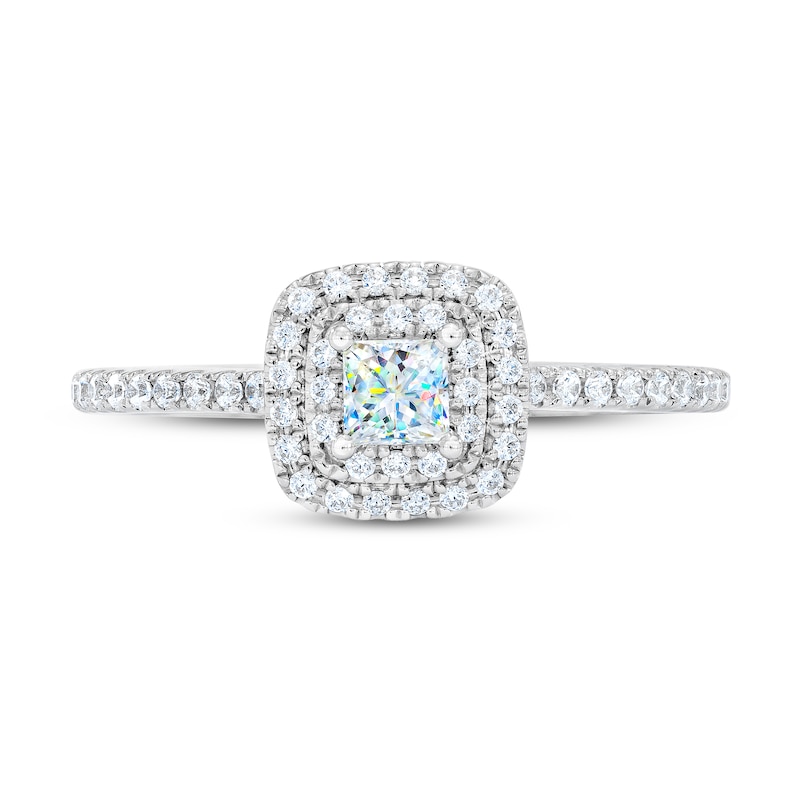 A 1/4-carat princess-cut First Light® diamond is the center of attention in this breathtaking engagement ring. From Leo Schachter, the independently certified diamond features Fire Prism™ technology that creates infinite flashes of color for more fire and sparkle. Shimmering round diamonds double halo the center and line the band, bringing the total diamond weight of the 14K white gold ring to 1/2 carat. The center diamond is laser-inscribed with a unique Gemscribe® serial number to ensure your peace of mind. Live Your Love in Color.™