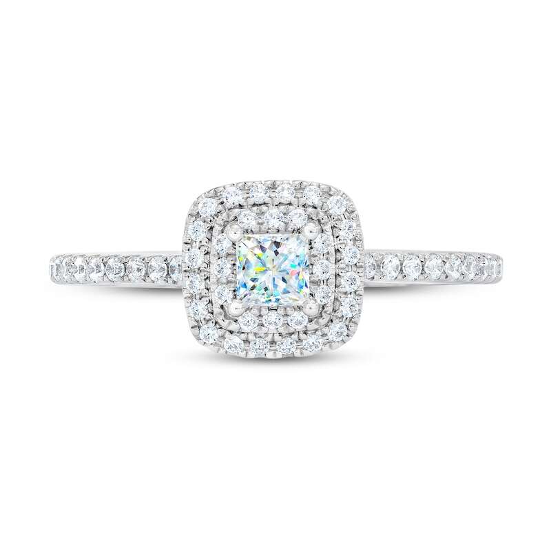 A 1/4-carat princess-cut First Light® diamond is the center of attention in this breathtaking engagement ring. From Leo Schachter, the independently certified diamond features Fire