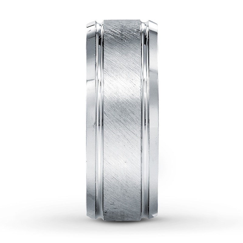This elegant 8mm wedding band features a brushed finish center and crisp engraved edges for a contemporary look. The ring is crafted in 10K white gold. This wedding band is available in sizes for men or women.