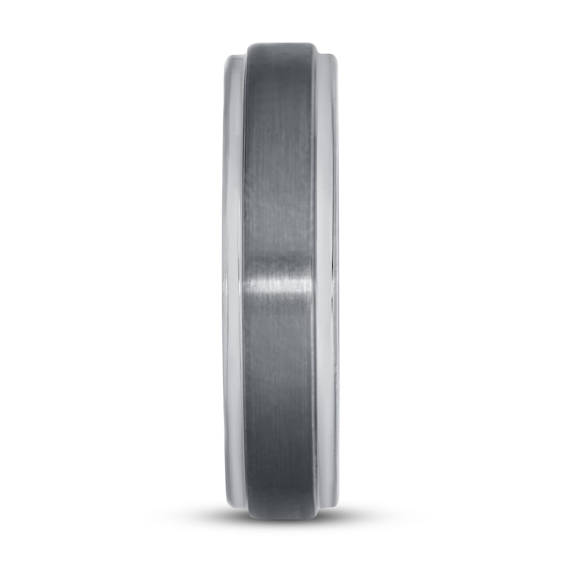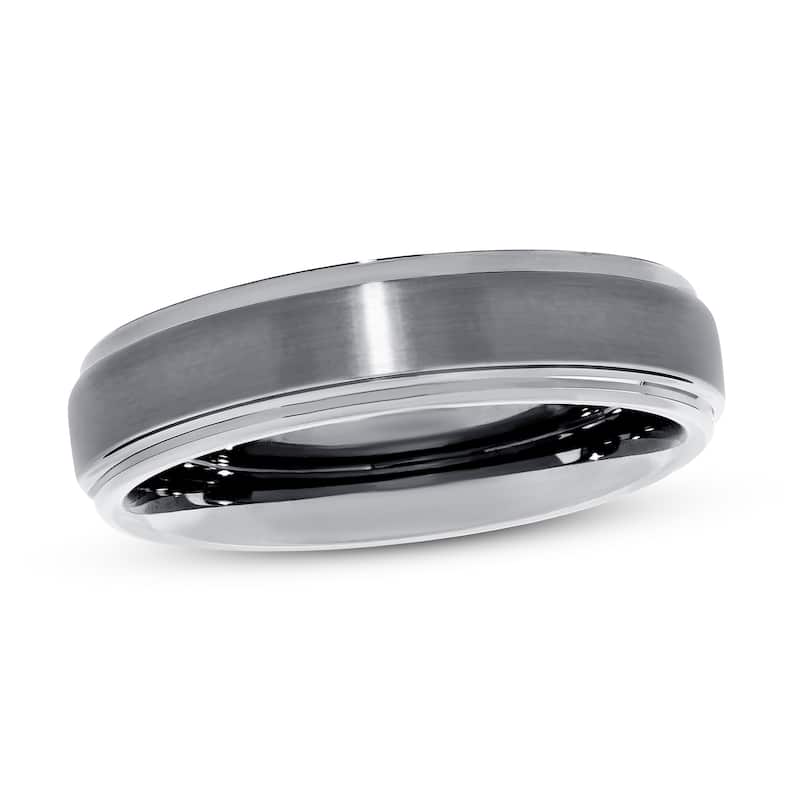 This sleek and timeless wedding band features a simple and classic design. The band measures 6 millimeters and is crafted in tungsten.